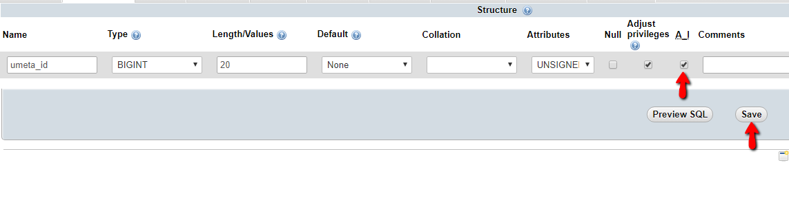After that click on Structure and then click on Change next to the primary key i.e. umeta_id